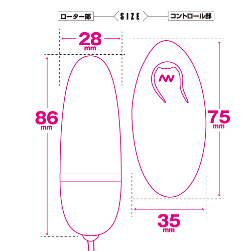 | サイズ/ 仕 様 | パッケージ:16.5×9.0×5.0cm 本体:ローター8.6×2.8cm・コントローラー全長7.5cm 重量:182g 電池:本体(単四電池×1本使用)、コントローラー(単四電池×1本使用) | ||