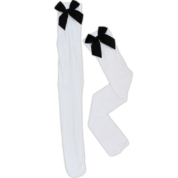 ●薄手の白いニーハイソックス●履き口に大きな黒リボンをON●足元をエレガントに彩るシンプルなコスプレ小物●かかとの縫製がないので前後どちらでも着用できます。