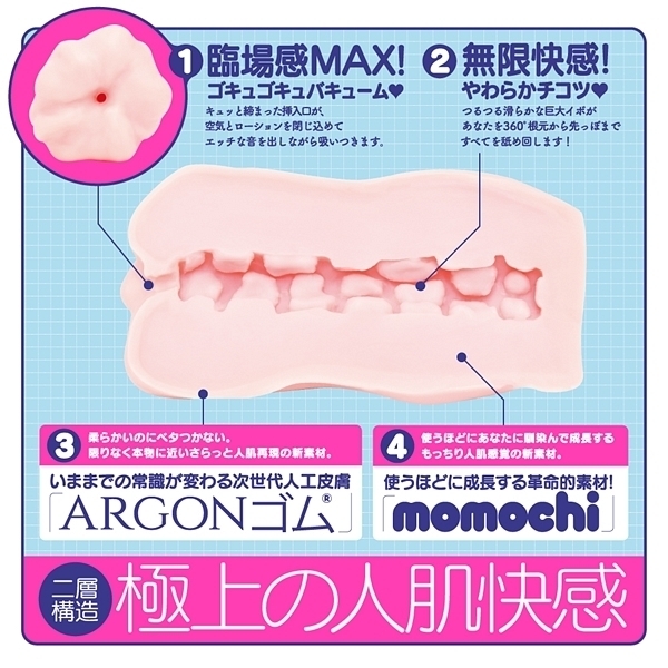 限りなく本物の肌と質感を追求した次世代人工皮膚素材を使用!いままでの常識が変わる次世代人工皮膚素材「ARGON(アルゴン)」を使用した非貫通オナホ「次世代HOLE XYZ 人工皮膚」です♪計算された内部構造にローションと空気の黄金比!極上の「ギュポギュポ」する吸い付きと挿れ心地は絶品です♪外層は柔らかいのにベタつかないさらっとした人肌再現の新素材を使用!内層は使うほどに成長する革命的素材「momochi」を使用することで、使えば使うほどにあなたに馴染んで成長するもっちり人肌感覚がたまりません♪劣化しずらい高い耐久性や弾力性も魅力的!2層構造が極上の人肌快感とキュッと締まった挿入口、そしてストロークの度にエッチなギュポ音を発する使用感が聴覚からもイキを誘発してくれそうです♪素材は安心の国産素材&国内生産。
