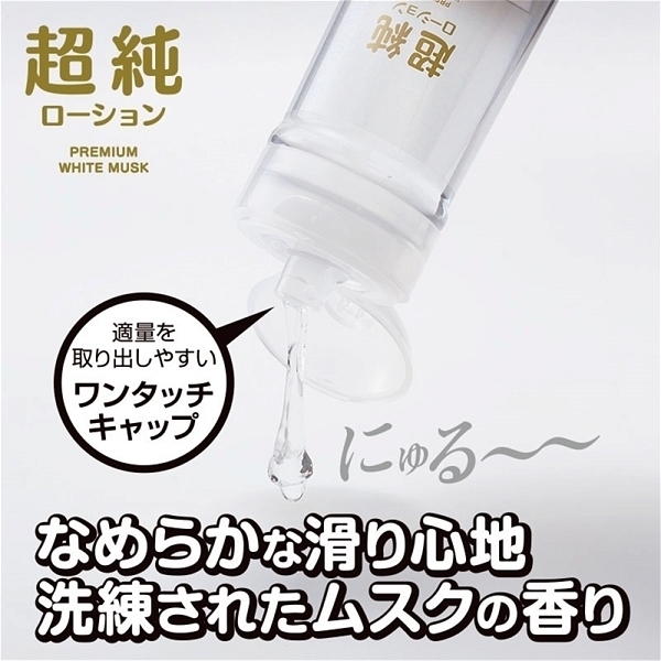 中庸なタイプの粘度で滑らかな肌触りと滑りが特徴の「超純ローション ホワイトムスク」です。